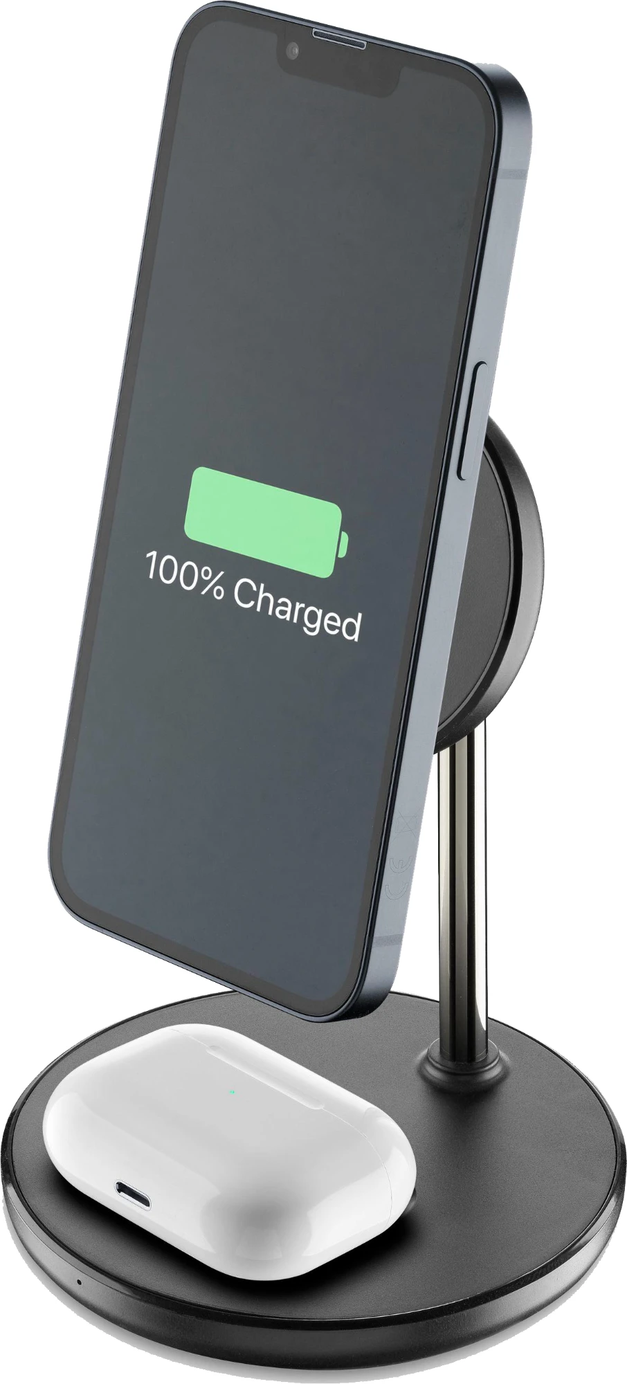 MAG DUO WIRELESS CHARGER ist die Tischhalterung mit magnetischem, kabellosem Ladegerät speziell für iPhone-Modelle, die mit der MagSafe-Technologie kompatibel sind.An der Unterseite der Halterung befindet sich ein Pad zum kabellosen Aufladen von Airpods und anderen mit dieser Technologie kompatiblen Kopfhörern.Für die Schnellaufladung mit einer Ladeleistung von 7,5 W wird ein adaptives USB-C-Netzteil mit mindestens 20W benötigt, das nicht im Lieferumfang enthalten ist.